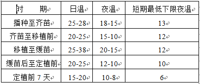 B棚室春茬番茄生產技術 (一)品種選擇:通過國家或省級品種審定委員會品種審(認)定的品種。耐低溫弱光、坐果率高、抗病性強、優質豐產、無限生長型品種。種子質量符合GB 16715.3茄果類2級以上要求。 1.播種育苗 (1)配制營養土 選用近五年未種過茄科植物的肥沃園田土6份、充分腐熟的廄肥或陳草炭土3份,細爐渣1份,過篩后按比例混配。育苗和移植前,每立方米混合土加入充分腐熟的雞糞10 kg、磷酸二銨1.5 kg和硫酸鉀1 kg,混拌均勻,覆蓋薄膜。 (2)配制藥土 選配制好的營養土,每立方米加入50 %多菌靈粉劑50 g和福美雙50 g混拌均勻,用塑料薄膜悶蓋,備用。 (3)種子處理與催芽 種子處理:將種子放入50℃-55℃的溫水中,不斷攪拌,保持恒溫15-20 min,撈出放入10%磷酸三鈉溶液中浸泡20 min,清水沖凈后在室溫下浸種6 h。 催芽:將處理好的種子表面黏液物質搓洗干凈,晾干種子表面的水膜,在25℃-28℃的溫度條件下催芽,50 %種子露白后降溫至20 ℃,80 %出芽后停止催芽。 (4)播種 ①播種期:塑料大棚栽培的播種期為1月上旬-2月中旬。 ②播種方法:播種前將配制的營養土澆足底水,水滲下后,將藥土均勻撒布床面上,厚約0.5 cm,然后將發芽種子均勻撒播,種子上再覆蓋藥土,厚度為1-1.5 cm,然后覆蓋地膜,70 %幼苗頂土時撤除床面覆蓋物。 2.苗期管理 (1)間苗及分苗 間苗:出苗后及時去掉病苗、弱苗和過密苗。 分苗:幼苗2-3片真葉時,開始移植。以預先配制好的營養土作為移植苗的生長基質。一般采用塑料營養缽作為移植苗的育苗容器,規格為直徑6-10 cm,高6-8 cm,每缽1株。 (2)溫度與光照管理 番茄苗期的溫度管理指標見表2。通過清潔溫室透明覆蓋物、后墻設反光幕等增加苗床的光照強度。盡量早揭晚蓋保溫覆蓋物,延長光照時間,陰雪天氣也要揭苫見光。 表2 苗期溫度管理指標(℃) (3)水肥管理 移植前要嚴格控水,不旱不澆水。移植水要澆透,以后根據水分狀況適當澆水??傮w原則是不旱不澆,控水、控肥,防止幼苗徒長。苗期一般不追肥,生長后期可用0.2%磷酸二氫鉀溶液進行葉面噴施。 (三)定植 1.棚室消毒 定植前7-10 d,每畝用硫磺粉2 kg、敵百蟲0.5 kg、鋸木屑0.75 kg混拌,分多處點燃,密閉24 h后通大風排味。 2.整地施肥 與茄科作物實行5年以上輪作。定植前深松土壤,耙平整細,按大溝距(畦間行距)80-90 cm,小溝距(畦內行距)45-50 cm開溝,做成寬窄行。結合整地作畦,施入腐熟有機肥作基肥,根據有機肥含氮量確定其施肥量,施入有機肥的純氮含量每畝不低于11 kg,有機肥2/3撒施、1/3溝施,一般每畝施入硫酸鉀為15 kg左右,化肥全部溝施。 3.定植時間 當10 cm土溫穩定在8 ℃以上,棚室內夜間最低氣溫不低于5 ℃時即可定植。越冬大棚加設二層幕和地膜覆蓋可在3月末至4月初定植,單層大棚在4月中旬定植。 4.定植方法 選晴天上午定植。一般株距30 cm左右,每畦雙行栽培,畦面上開溝,隨水栽苗。穴施磷酸二銨作口肥,每株3-4 g,表土半干后中耕松土2-3次,由淺漸深,并在畦面中心開淺溝,向兩側培土,將畦面整理成馬鞍狀,畦上覆蓋地膜。 (四)定植后管理 1.溫度管理 定植后,密閉棚室,防寒保溫,促進緩苗,晝溫保持在28 ℃-30 ℃,夜溫不低于15 ℃,地溫不低于12 ℃。緩苗后,晝溫降至22 ℃-25 ℃,夜溫不低于10 ℃。結果期,實行變溫管理,上午25 ℃-28 ℃,下午25 ℃-20 ℃,上半夜20 ℃-15 ℃,下半夜15 ℃-10 ℃。 2.光照管理 選用透光性好的塑料薄膜,經常保持膜面清潔,日光溫室后墻張掛反光幕,增加棚室內的光照強度。適當早揭、晚蓋保溫覆蓋物,盡量延長植株的見光時間。 3.肥水管理 緩苗后至第1穗果坐住前:以中耕松土、提高地溫為主,控制澆水,促根控秧。 第1穗果坐住后:結合灌水,追施尿素每畝為6-8 kg。 第2穗果坐住后:進行第2次追肥,每畝追施尿素為5-6 kg、硫酸鉀4-6 kg。 澆水時把畦端地膜揭開,沿畦面中心的淺溝進行膜下暗灌。土壤微量元素缺乏的地區,還應針對缺素的狀況增加追肥的種類和數量。 4.植株調整 第1穗果開花,用尼龍繩吊蔓或用細竹竿插架。多采用單桿整枝,每株留3-4穗果。留足果穗后,留兩片葉摘心。要及時清除病果、蟲果、病株,摘除下部枯黃葉片,以減少病蟲基數和呼吸消耗。 5.保果疏果 保果:第1穗和第2穗果的坐果期,要用熊蜂輔助授粉,放熊蜂每畝為1-2箱,或用手持振蕩器對已經開放的花朵進行震動,促進花粉散出,促進授粉受精。 疏果:大果型品種每穗選留3-4個果,中果型品種每穗留4-6個果。 (五)病蟲害防治 1.防治原則 預防為主,綜合防治。優先采用農業防治、物理防治、生物防治,科學合理地使用化學防治。合理混用、輪換用藥,控制用藥次數,延緩病原菌和害蟲產生抗藥性,嚴格控制農藥安全間隔期,避免農藥殘留。 2.主要病蟲害的防治措施 (1)病毒病 發病初期選用20 %病毒A可濕性粉劑每畝為70 g,或1.5 %植病靈水劑每畝為100 mL,或5%菌毒清每畝為200-300 mL噴霧防治。 (2)灰霉病 發病初期使用50 %腐霉利可濕粉每畝為60 g,或50 %乙霉威每畝為70 mL噴霧防治,或50 %異菌脲可濕性粉劑每畝為40-70 g噴霧防治。花謝后及時摘除花冠,可減輕灰霉病的發生。 (3)晚疫病 發病初期,用 5 %的百菌清粉塵劑或5 %霜霉威粉塵劑每畝為1 kg噴粉防治;或用5 %霜霉清煙劑每畝為1 kg熏煙防治;也可用64 %啞霜錳鋅可濕性粉劑每畝為150 g,或75 %百菌清可濕性粉劑每畝為200 g噴霧防治。 (4)葉霉病 發病初期,選用40 %氟硅唑每畝為1.5-2 g,或2 %武夷霉素每畝