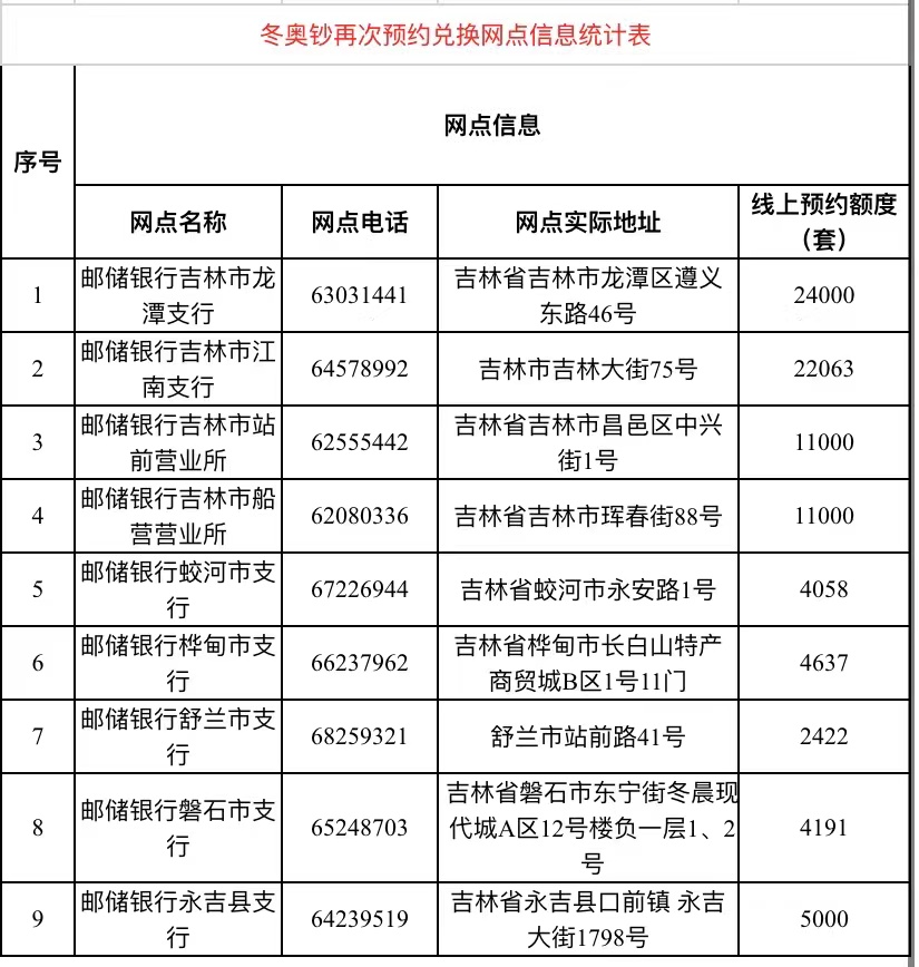 根據中國人民銀行關于第24屆冬季奧林匹克運動會普通紀念幣、紀念鈔再次預約兌換工作安排,中國人民銀行定于2022年2月11日起發行第24屆冬季奧林匹克運動會普通紀念幣(以下簡稱“冬奧幣”)、第24屆冬奧林匹克運動會紀念鈔(以下簡稱“冬奧鈔”)再次預約兌換工作。全部采用預約兌換方式。中國郵政儲蓄銀行吉林市分行承擔吉林市轄內第24屆冬季奧林匹克運動會普通紀念幣、紀念鈔再次預約兌換工作。 一、承辦地區 中國郵政儲蓄銀行吉林市分行承辦冬奧幣、冬奧鈔再次預約兌換的地區為:吉林、蛟河、樺甸、舒蘭、磐石、永吉(市、縣)的部分地區。其中:預約兌換網點共9個,其他網點不提供預約兌換服務(具體預約兌換網點及分配額度附后)。 二、時間安排 (一)預約期:2022年2月11日22:30-2月13日24:00。 冬奧幣、冬奧鈔的預約業務辦理。預約渠道為線上預約??蛻艨捎?/span>2022年2月11日22:30起登錄中國郵政儲蓄銀行官方網站、手機銀行、微信公眾號、個人網銀辦理預約。預約期內先到先得,額滿為止。線上預約:您可登錄以下網站或APP辦理預約: 1、郵儲銀行官方網站:訪問www.psbc.com,首頁-公告欄-紀念幣公告-點擊進入預約。 2、郵儲銀行手機銀行APP:首頁-全部-網點模塊-紀念幣預約。 (1)蘋果手機下載方式:打開蘋果App Store,在搜索框中輸入“郵儲銀行”即可找到“郵儲銀行手機銀行”產品,點擊按鈕下載。 (2)安卓手機下載方式:打開安卓應用商店,在搜索框中輸入“郵儲銀行”即可找到“郵儲銀行手機銀行”產品,點擊按鈕下載。 (3)郵儲銀行微信公眾號:關注“中國郵政儲蓄銀行”-點擊郵服務模塊-紀念幣專區-紀念幣預約。 (4)郵政銀行個人網銀網:訪問https://pbank.psbc.com/perbank/,首頁-個人網銀登錄-我的賬戶-紀念幣管理-紀念幣預約。 (二)核實期:2022年2月16日-2月17日。 預約期結束后,中國人民銀行將冬奧幣、冬奧鈔全部預約登記記錄進行核查,詳細核查事項請查看《中國人民銀行公告〔2019〕第26號》。 核實期內,未通過中國人民銀行核查的客戶,可持預約登記時的第二代居民身份證原件前往預約登記的網點,在網點營業時間內辦理撤銷違約記錄和保留兌換資格業務。逾期不予辦理。 核實期結束后,未通過中國人民銀行核查的,且未辦理撤銷違約記錄和保留兌換資格業務的客戶,將無法辦理冬奧幣、冬奧鈔預約兌換業務。 (三)兌換期:2022年2月18日-2月24日。 兌換期內,預約成功的客戶須持預約登記的本人有效第二代居民身份證原件,在約定日期至預約時約定的兌換網點辦理冬奧幣、冬奧鈔兌換業務。兌換期結束,停止兌換,預約作廢。 三、注意事項 (一)冬奧幣、冬奧鈔以套為單位進行預約、兌換。每人預約、兌換限額分別為20套。 (二)公眾在承辦銀行網點辦理冬奧幣、冬奧鈔預約、兌換、撤銷違約記錄及保留兌換資格業務的,須持本人有效第二代居民身份證原件;代他人辦理預約、兌換、撤銷違約記錄及保留兌換資格業務的,須提供代辦人和被代辦人有效第二代居民身份證原件,且被代辦人數不超過5人。由于第二代居民身份證原件遺失、未成年人未辦理第二代居民身份證等原因,無法出具第二代居民身份證原件的,可以使用戶口簿、臨時居民身份證原件辦理。 (三)客戶如對其預約記錄存在異議,可在預約核實期內,持預約登記時使用的第二代居民身份證原件,至中國人民銀行地市中心支行及以上分支機構查詢,查詢地址以人民銀行公告為準。 (六)因疫情原因,冬奧幣、冬奧鈔相關工作存在延期可能性,具體情況以我行當地分支機構公告為準。 (七)更多詳情可咨詢我行客服與投訴熱線95580。 冬奧幣再次預約兌換網點信息統計表 |