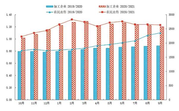 為了準(zhǔn)確掌握我省玉米秋收生產(chǎn)情況,預(yù)判秋收市場形勢,近日,吉林省農(nóng)村經(jīng)濟(jì)信息中心對公主嶺、長嶺、蛟河等8個縣市32個農(nóng)戶進(jìn)行了電話咨詢調(diào)研。現(xiàn)就全省玉米秋收生產(chǎn)及市場形勢分析如下: 玉米生產(chǎn)情況 (一)農(nóng)田土壤底墑較好,氣象條件有利于玉米生長 今春,我省土壤解凍較快,化凍深度比常年偏深,農(nóng)田土壤底墑較好,缺墑面積小,缺墑程度輕,氣象條件總體適宜,有利于春耕生產(chǎn)。據(jù)我省農(nóng)田土壤墑情監(jiān)測,截至5月5日,吉林省旱田耕地淺層(10厘米)土壤缺墑面積為82萬畝(輕度缺墑),僅占全省旱田耕地面積的1.1%。玉米出苗苗齊、苗全、苗均,保苗率達(dá)到96.21%,同比提高0.15個百分點(diǎn)。作物生長期雨水充沛,氣溫較高,長勢良好。收獲前期土壤濕度較大,但10月中下旬氣象條件總體較好,有利于土壤降濕,農(nóng)民延后收割,玉米成熟度較好,水份偏低,品質(zhì)較好。 (二)積極采取措施,確保玉米穩(wěn)供增收 為了保障糧食播種面積和促進(jìn)增產(chǎn)增收,省委、省政府積極采取各項(xiàng)措施,包括落實(shí)支持產(chǎn)糧大縣政策,采取防災(zāi)減災(zāi)措施、進(jìn)行高標(biāo)準(zhǔn)農(nóng)田建設(shè)和黑土地保護(hù)利用試點(diǎn)建設(shè)。農(nóng)民種植積極性較高,2021年全省玉米種植面積6762.4萬畝,比上年增加177.1萬畝,同比增加2.69%。(省農(nóng)業(yè)農(nóng)村廳內(nèi)部工作數(shù)據(jù))。從調(diào)查情況看,今年是近年來玉米生產(chǎn)形勢最好的一年,預(yù)計玉米單產(chǎn)增幅在10%-15%之間。 成本收益分析 今年我省玉米種植成本整體呈現(xiàn)“兩漲兩平兩降”格局,即化肥費(fèi)用和租地費(fèi)用明顯上漲,種子費(fèi)用和農(nóng)藥費(fèi)用持平,由于沒有大面積的倒伏和機(jī)械化程度的提高,機(jī)械費(fèi)用明顯下降,秋收時工價雖然上漲,但用工量減少,人工費(fèi)用明顯下降。總體而言,普通農(nóng)戶總成本略有下降、規(guī)模經(jīng)營總成本增加,由于玉米單產(chǎn)增加和新糧開秤價格略高于去年同期,普通農(nóng)戶和規(guī)模經(jīng)營的純收益均增加,規(guī)模經(jīng)營由于地租價格上漲幅度較大,純收益增長幅度低于普通農(nóng)戶。 公主嶺、長嶺、蛟河等8個縣市普通農(nóng)戶和規(guī)模經(jīng)營典型調(diào)查的成本收益具體如下: (一)種植成本 普通農(nóng)戶每畝總成本為662.7元,同比減少124.5元,降低15.8%。生產(chǎn)資料(種子、農(nóng)藥、化肥)投入為281.5元,同比增加18.1元,提高6.9%。其中,種子費(fèi)用為58.9元,同比增加0.8元,提高1.4%;農(nóng)藥費(fèi)用為22.4元,同比增加0.2元,提高0.9%;化肥費(fèi)用為200.2元,同比增加17.1元,提高9.3%。物資與服務(wù)費(fèi)用為422.8元,同比增加0.5元,提高0.1%,其中,機(jī)械費(fèi)用為141.3元,同比減少17.6元,降低11.1%。由于普通農(nóng)戶不考慮租地費(fèi)用,生產(chǎn)成本與總成本相同。其中,人工費(fèi)用為239.9元,同比減少125.0元,降低34.3%。 規(guī)模經(jīng)營每畝總成本為1097.6元,同比增加53.6元,提高5.1%。生產(chǎn)資料(種子、農(nóng)藥、化肥)投入為265.1元,同比增加17.3元,提高7.0%。其中,種子費(fèi)用為51.3元,同比增加0.9元,提高1.8%;農(nóng)藥費(fèi)用為20.9元,同比增加0.2元,提高1.0%;化肥費(fèi)用為192.9元,同比增加16.2元,提高9.2%。物資與服務(wù)費(fèi)用為416.3元,同比減少14.1元,降低3.3%,其中,機(jī)械費(fèi)用為151.2元,同比減少31.4元,降低17.2%。生產(chǎn)成本為587.2元,同比減少111.0元,降低15.9%。其中,人工費(fèi)用為170.9元,同比減少96.9元,降低36.2%。租地費(fèi)用為510.4元,同比增加164.6元,提高47.6%。 (二)種植收益 普通農(nóng)戶每畝單產(chǎn)為1224.0斤,同比增加113.5斤,提高10.2%;按標(biāo)準(zhǔn)水價格1.10元/斤計算,每畝主產(chǎn)品產(chǎn)值為1346.4元,同比增加136.0元,提高11.2%;扣除總成本,每畝純收益為683.7元,同比增加260.5元,提高61.5%。若考慮普通農(nóng)戶可獲得農(nóng)業(yè)支持保護(hù)補(bǔ)貼、生產(chǎn)者補(bǔ)貼和生產(chǎn)資料一次性補(bǔ)貼共計200元左右,補(bǔ)貼后每畝純收益可達(dá)到800元以上。 規(guī)模經(jīng)營每畝單產(chǎn)為1234.0斤,同比增加118.4斤,提高10.6%;按標(biāo)準(zhǔn)水價格1.12元/斤計算,每畝主產(chǎn)品產(chǎn)值為1382.1元,同比增加143.8元,提高11.6%;扣除總成本,每畝純收益為284.5元,同比增加90.2元,提高46.4%。若考慮規(guī)模經(jīng)營主體多數(shù)只能獲得生產(chǎn)者補(bǔ)貼和生產(chǎn)資料一次性補(bǔ)貼共計100元左右,補(bǔ)貼后每畝純收益近400元。 玉米市場情況 2020/2021市場年度,我省玉米市場理性回歸,玉米價格平均水平高于去年同期,整體呈現(xiàn)“兩起兩落”走勢(見圖)。 從農(nóng)民出售價格看,市場年月平均收購價(標(biāo)準(zhǔn)水,下同)為1.22元/斤,同比增加0.32元/斤,提高35.55%。2020年10月至2021年2月農(nóng)民出售玉米價格從1.04元/斤上漲至1.32元/斤;3-4月,冰雪消融,氣溫回暖,農(nóng)民集中賣糧,價格跌到1.21元/斤;5-6月,農(nóng)民手中余糧逐漸減少,價格回升至1.29元/斤;7-9月,我省玉米多集中在中間環(huán)節(jié),飼料企業(yè)谷物替代作用明顯,價格下調(diào)至1.23元/斤。10月末,農(nóng)村基層26-30個水新糧開秤價格為0.80-0.99元/斤,折干后平